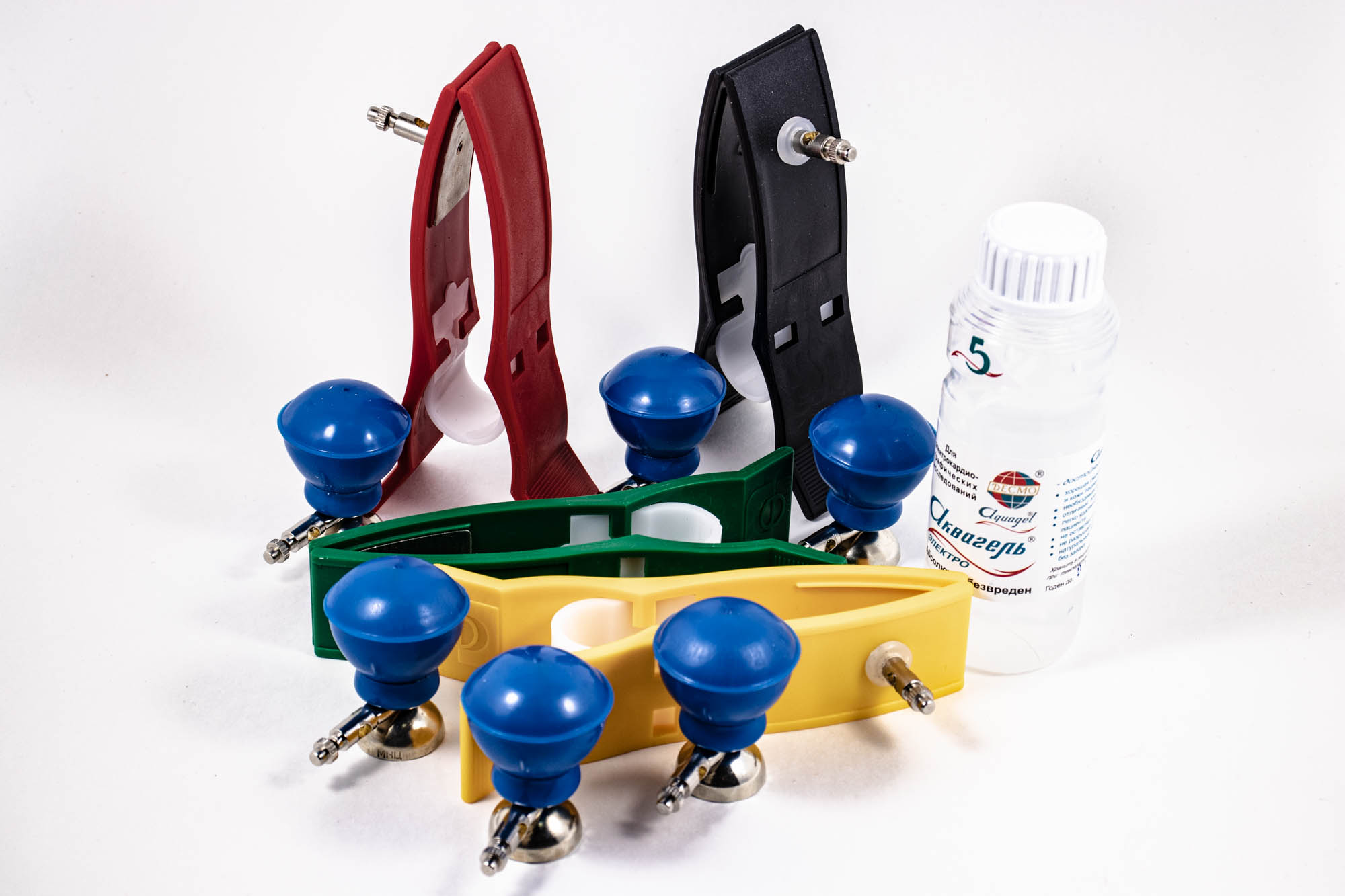 Набор электродов ЭКГ многоразового использования бессеребряных для взрослых (с поджимным винтом под кнопку и штекер 2-4 мм). Прищепки ЦВЕТНЫЕ.