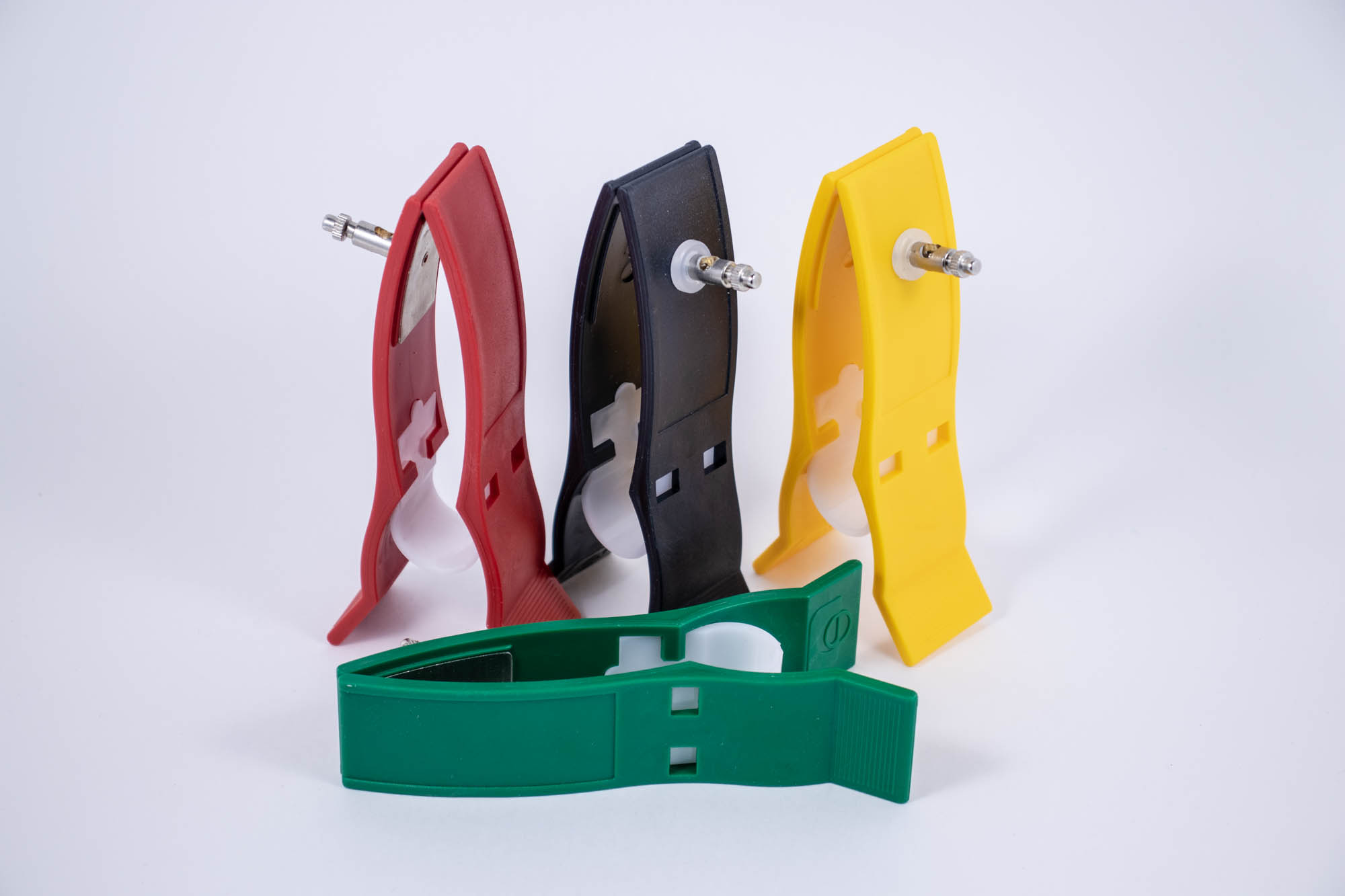 Комплект КОНЕЧНОСТНЫХ электродов ЭКГ многоразового использования бессеребряных для взрослых (с поджимным винтом под кнопку и штекер 2-4 мм ). Прищепки ЦВЕТНЫЕ.