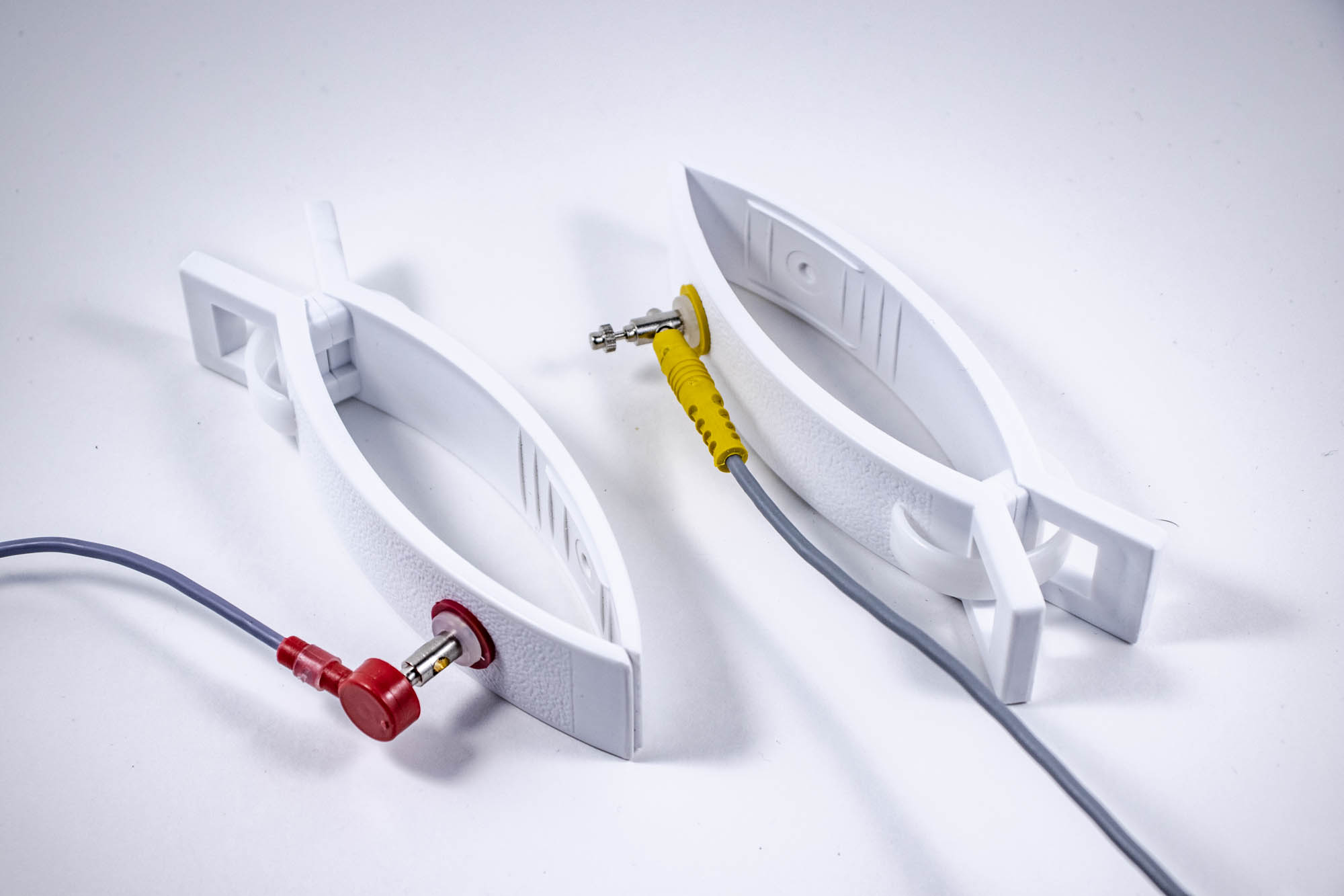 Электрод с поджимным винтом под кнопку и штекер 2-4 мм. Цвет прищепки БЕЛЫЙ, маркировка на выбор (втулки красного, желтого, черного, зеленого цветов). Размер прищепки 146х40х30мм.